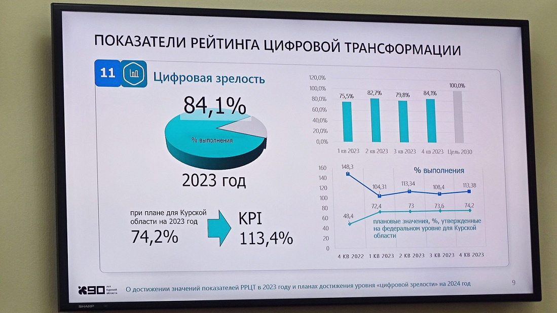Самый весомый показатель в составе рейтинга – уровень цифровой зрелости, он оценивается по 5 отраслям: общественный транспорт, образование, здравоохранение, городское хозяйство и строительство, госуправление. В Курской области уровень цифровой зрелости в 2023 году достиг 84,1%, это на 13,4% больше планового значения.